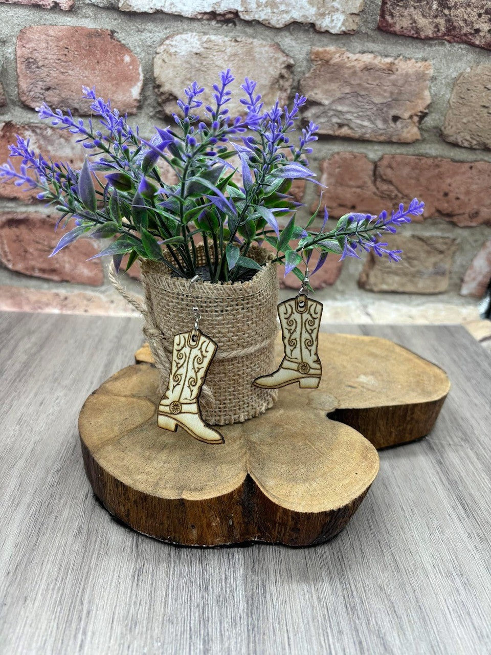 Lightweight wooden earrings in the shape of cowboy boots with silver ear hooks.
